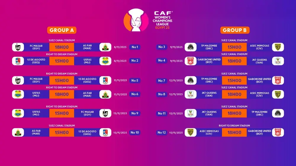 The fifth edition of the CAF Women’s Champions League will take place from 8 to 21 November 2025 in Egypt. It will be the second time the country hosts the competition, following the inaugural edition in 2021.